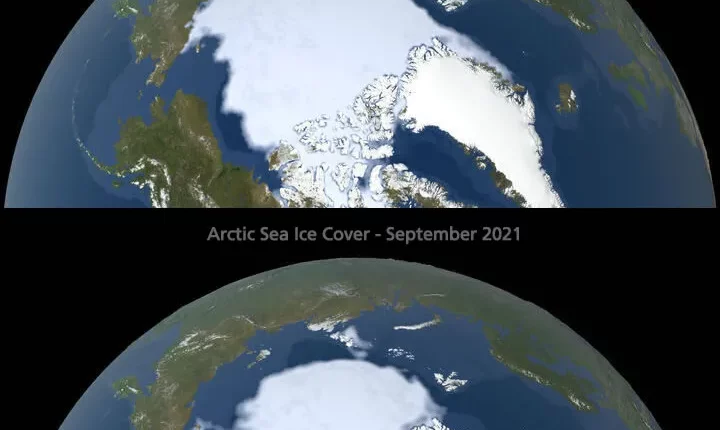 Arctic sea ice cover is shrinking at a rate of 13% per decade. Here is a satellite image of Arctic sea ice in 1979 (covering 6.90 million square kilometers) compared to Arctic sea ice in 2021 (covering 4.72 million square kilometers). As of 2021, the lowest sea ice values on record occurred in 2012, covering an area of only 3.39 million square kilometers.